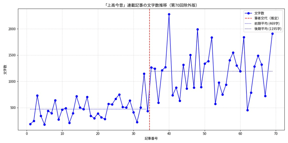 記事一つにおける文字数も変わっています。全70記事のデータから第70回を除外した69記事を分析対象としました。執筆者交代の境界として第1回~第34回の前期と第35回~第69回の後期に分類しました。記事数は前期後期ともに34件ありますが平均の文字数は469.9字から1195.1字と2.54倍に急増。中央値では453.0字から1254.0字と2.77倍になっています。最小、最大文字数でも違いは明白でそれぞれ前期では181字、1147字であるのに対し後期では452字、2276字と一目瞭然です。
