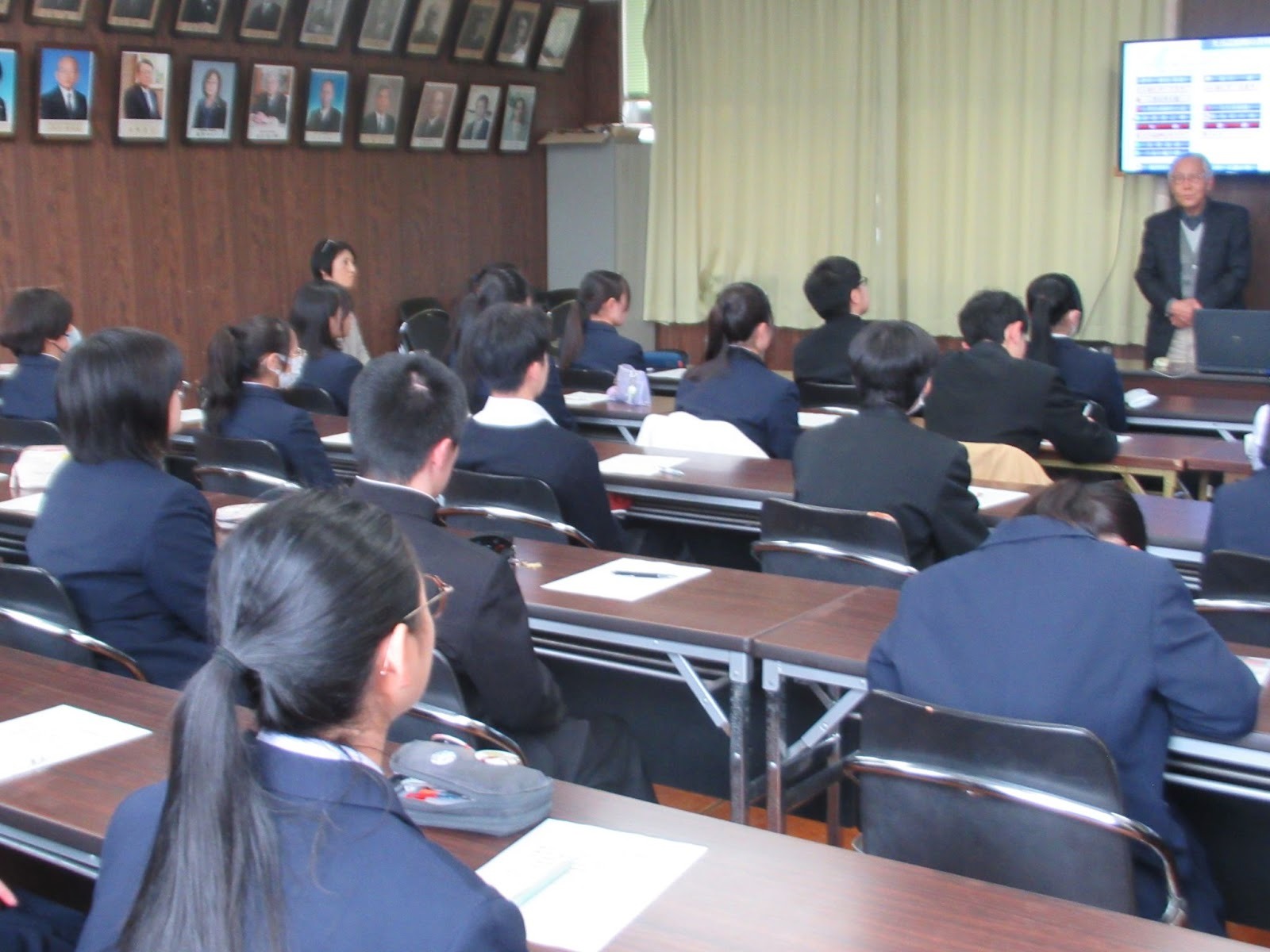 令和8年2月10日、普通科で行っている総合的な探究の時間「くまたん」に、本校昭和27年度普通科御卒業の渡部英綱様(92)に御来校いただき、御講演をいただきました。本校が「上浮穴農林学校」から普通科も有する「上浮穴高等学校」になったのは、昭和23年度のことで、上高初期の様子を知る方から生の声を聴ける貴重な機会です。
