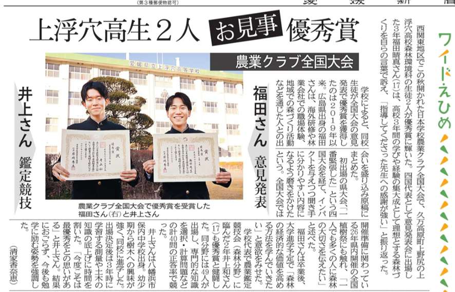 大晦日の愛媛新聞に、農業クラブ全国大会で入賞を果たした二人の活躍が掲載されていましたので、